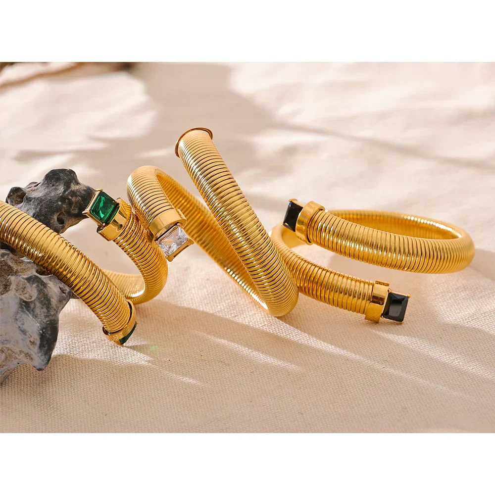 This high-quality golden jewelry piece features a trendy metal statement design, adorned with cubic zirconia stones in white, green, and black. Crafted with durable stainless steel and elastic material, this bracelet bangle offers a comfortable and stylish addition to any outfit. Elevate your accessory game with elegant and modern design.