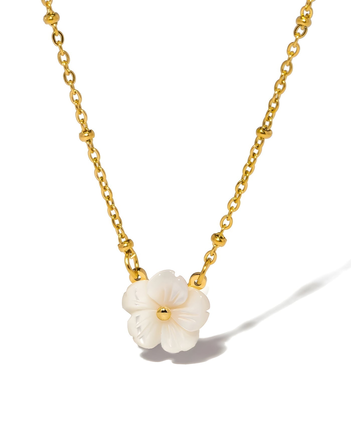 Introducing the Zori Luxe Elegant Flower Shell Necklace for Women. Made with high-quality stainless steel, this necklace boasts a beautiful flower shell design and a colorfast chain. Perfect for adding a touch of elegance to any outfit. Invest in this timeless, durable piece today.
