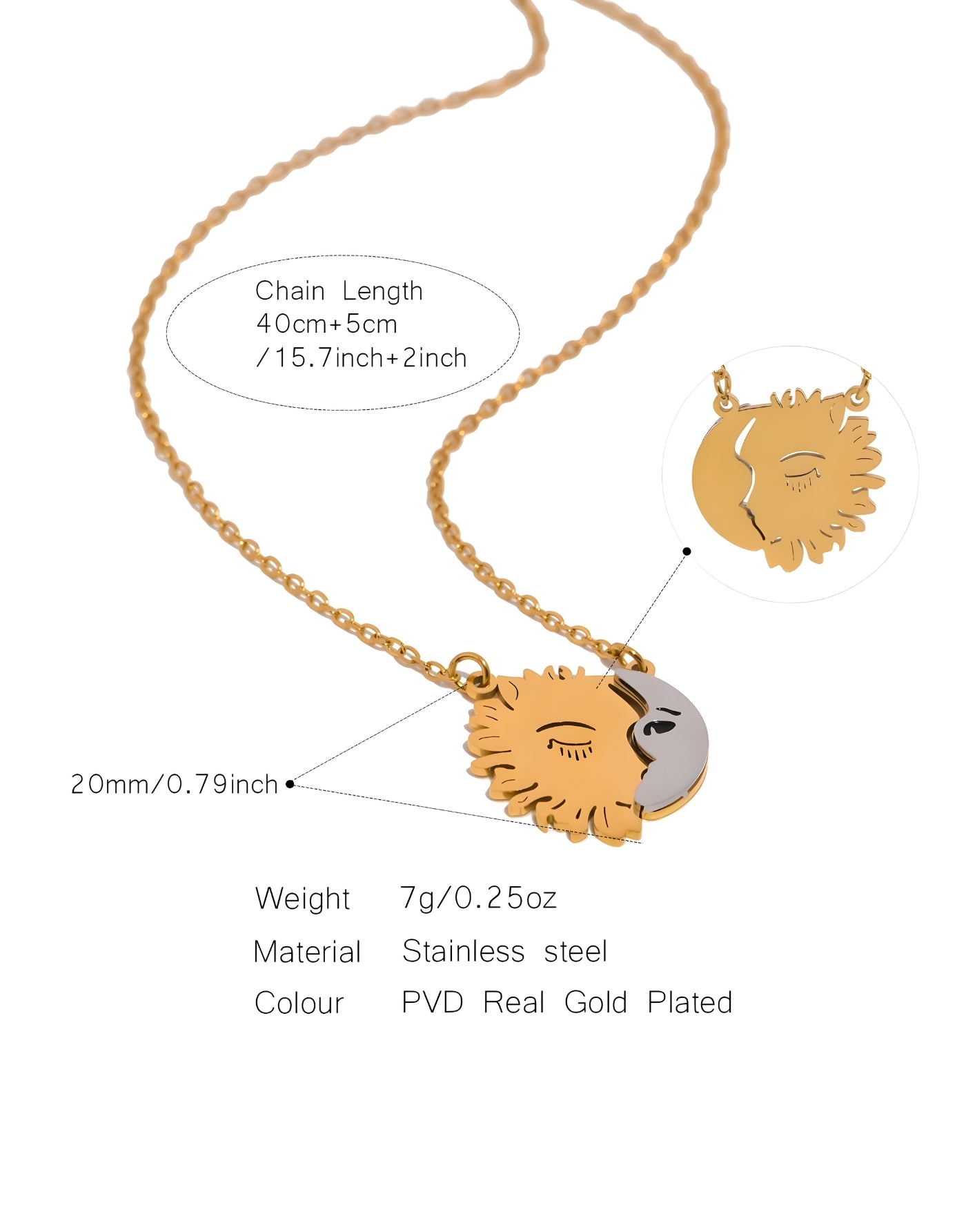 This Sun and Moon Pendant Necklace for Women by JORIEL is crafted from durable stainless steel and features a stunning gold-plated design. Elegant and versatile, this pendant adds a touch of celestial charm to any outfit. A must-have for any jewelry collection.